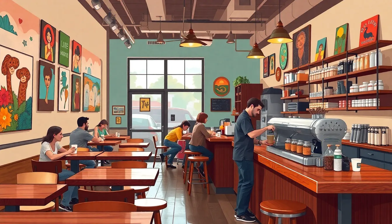 Colorful local artwork adorns the walls, enhancing the artistic atmosphere. Comfortable seating arrangements encourage groups to gather and share ideas. Natural light pours through large windows, creating an inviting environment for a mid-morning latte or an afternoon cold brew. The sound of steaming milk and brewing coffee fills the air, adding to the sensory experience. Unique decor elements reflect Chattanooga’s culture, making the space feel like a home away from home.